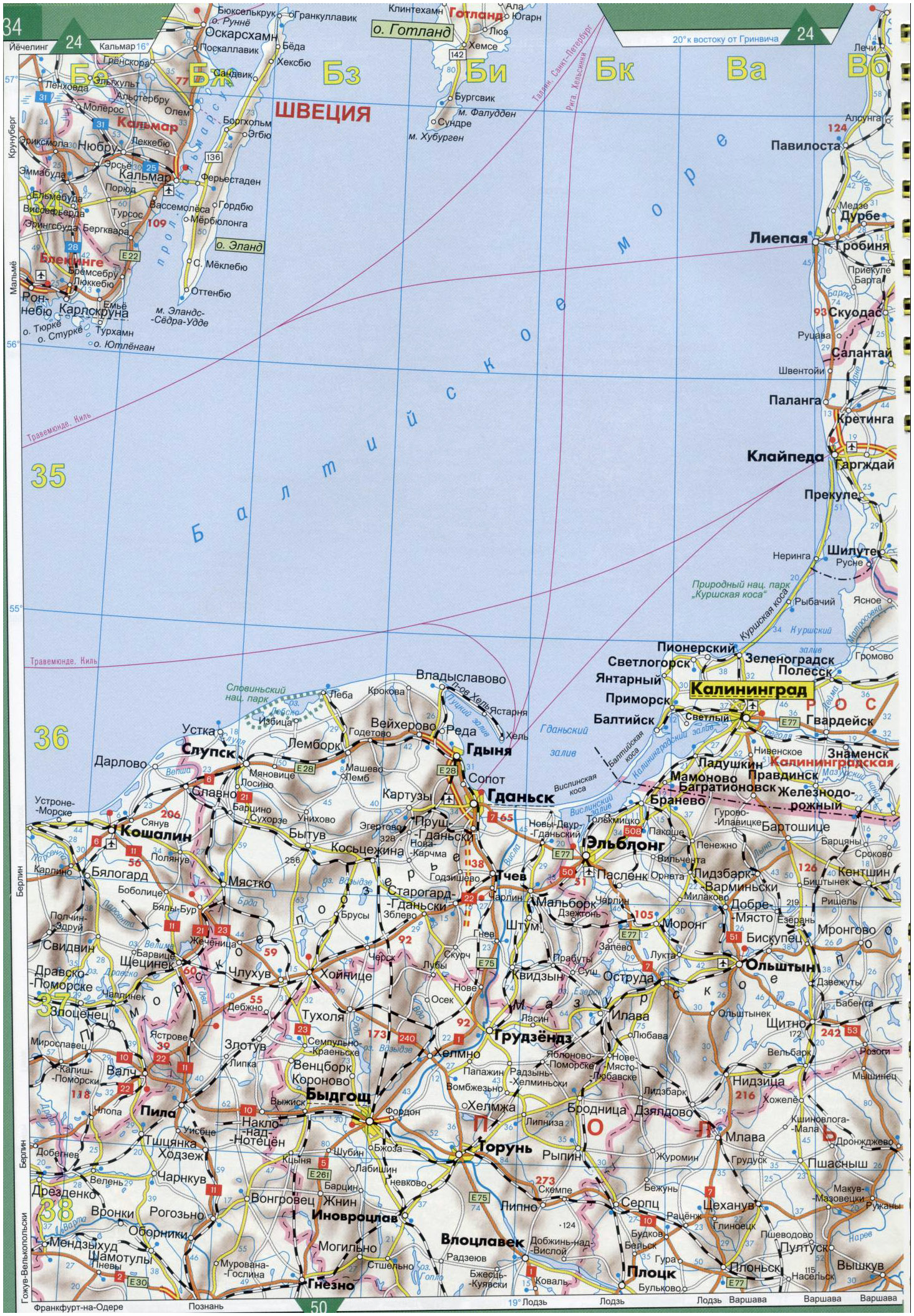 Карта автодорог Калининградской области. Подробные карты - Калининградская область масштаба 1см=20км.